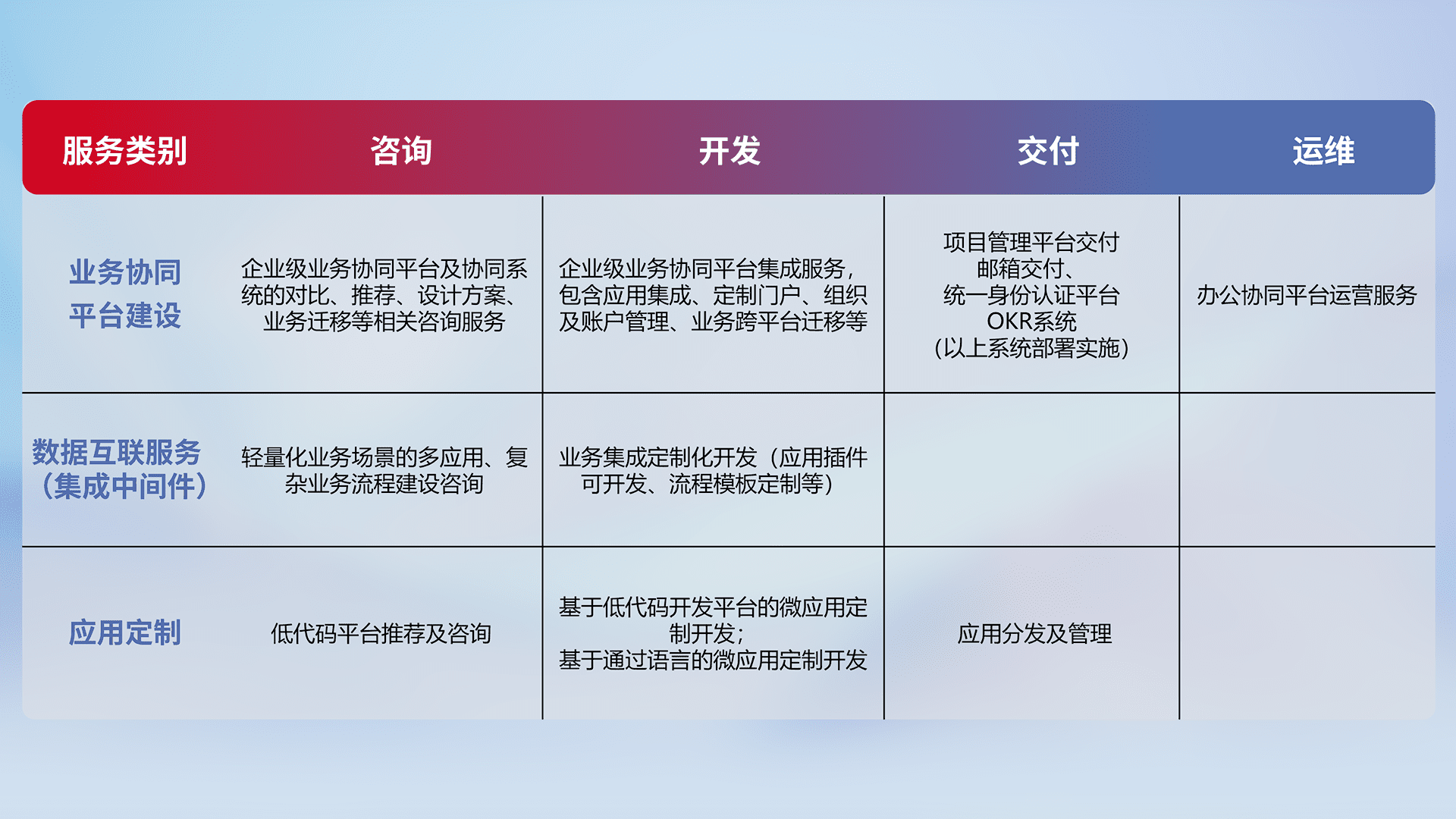 针对钉钉、、企微、、、IDaas等平台级产品提供产品的规划、、、、方案、、交付、、、定制化开发等服务,,实现如统一协同办公、、、智能客户服务、、、、混合会议管理、、、智能数据查询、、等业务场景,,,实现数字化转型。。。。